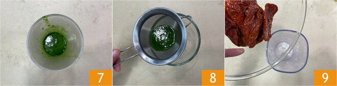 Une fois le mélange mixé 7, passez-le au tamis 8 et mettez de côté. Passez au pesto : dans un récipient haut, mettez les tomates séchées égouttées 9.