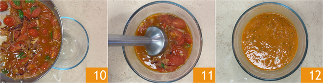 Versez la sauce dans un récipient 10 et mixez avec un mixeur plongeant 11 pour obtenir une sauce homogène 12. Si vous le souhaitez, vous pouvez passer la sauce au tamis pour la rendre encore plus lisse et veloutée.