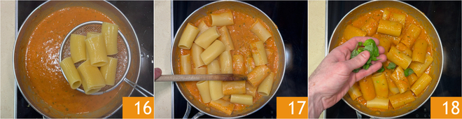 À ce stade, les pâtes seront cuites, égouttez-les directement dans la poêle avec la sauce 16 et mélangez délicatement 17. Enfin, ajoutez encore quelques feuilles de basilic 18.