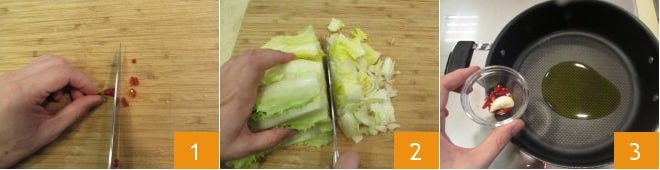 Pour préparer les pâtes de légumineuses avec scarole et olives, commencez par nettoyer le piment : retirez le chapeau et coupez-le en rondelles 1. Nettoyez les scaroles en retirant la base et en les coupant ensuite en morceaux d'environ 3 cm 2. Rincez soigneusement et passez aux fourneaux. Mettez une casserole sur le feu et chauffez un filet d'huile avec le piment émincé et l'ail en chemise 3.