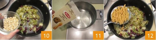 et les pignons grillés 10. Pendant ce temps, vous pouvez cuire les casarecce de pois chiches en les plongeant dans une casserole d'eau bouillante et salée 11. Dès qu'elles sont al dente, égouttez-les directement dans la sauce 12.