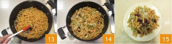Mélangez pour bien amalgamer les ingrédients 13 et dès que tout est prêt 14 il ne vous reste plus qu'à dresser. Voici vos pâtes de légumineuses avec scarole et olives prêtes, servez-les encore très chaudes 15 !