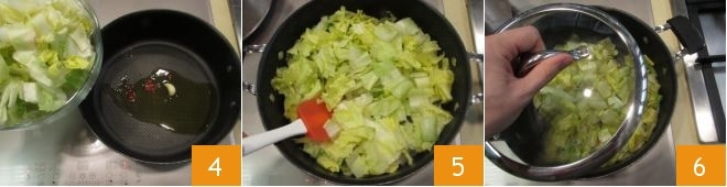 Plongez les scaroles 4 et faites-les cuire pendant une dizaine de minutes en remuant de temps en temps 5, couvrez avec le couvercle pendant la cuisson 6.