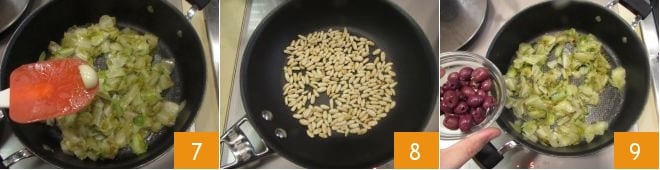 En fin de cuisson, souvenez-vous de retirer l'ail 7 et en attendant, faites griller les pignons dans une poêle antiadhésive pendant quelques minutes 8. Ensuite, ajoutez les olives de Gaeta dans la poêle 9,