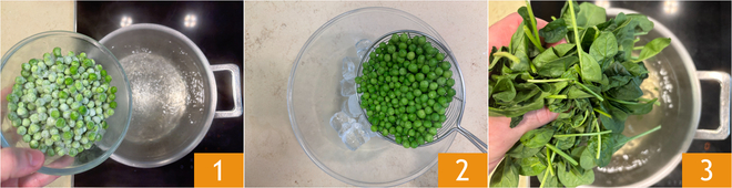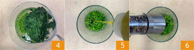 Égouttez et plongez également les épinards dans de l'eau glacée 4. Égouttez les légumes et transférez-les dans un récipient, en veillant à réserver environ 50 g de petits pois pour le dressage. Assaisonnez avec de l'huile 5, du sel et du poivre 6.