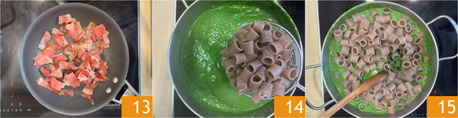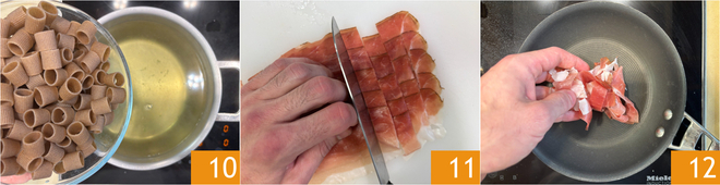 Faites cuire les pâtes de sarrasin dans la même eau où vous avez blanchi les légumes 10. En attendant, coupez grossièrement le speck 11 et faites-le griller brièvement dans une poêle 12.