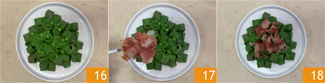 Dressez et complétez avec les petits pois réservés 16 et le speck 17. Vos pâtes de sarrasin avec crème de petits pois et speck croustillant sont prêtes à être servies 18 !