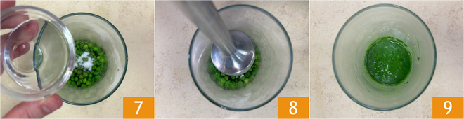 Ajoutez un peu d'eau de cuisson 7 et mixez avec un mixeur plongeant 8 jusqu'à obtenir une crème lisse et homogène 9. Transférez la crème dans une poêle et réservez.