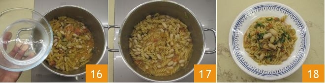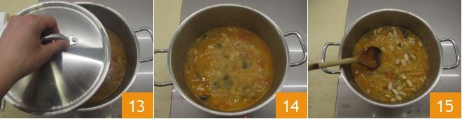 couvrez avec le couvercle 13 et faites cuire à feu moyen, mais pas trop élevé, pendant 20 minutes, en remuant de temps en temps. Après ce temps, retirez le couvercle 14 et faites cuire encore 15-20 minutes ou jusqu'à ce que les haricots soient tendres. À ce stade, versez les pâtes et remuez 15.