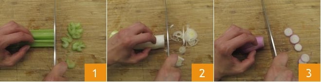 Pour réaliser les pâtes et haricots d'été, commencez par laver et équeuter le céleri et le couper en rondelles 1, puis épluchez le poireau, équeutez-le et tranchez-le finement 2. Nettoyez l'oignon vert et coupez-le de la même manière 3.