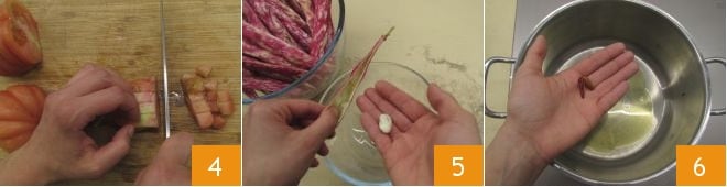 Lavez les tomates, coupez-les en tranches puis en dés 4. Enfin, écaillez les haricots frais 5. Une fois les légumes prêts, vous pouvez passer à la cuisson : chauffez l'huile dans une grande casserole, assaisonnez avec le piment pendant quelques instants 6.
