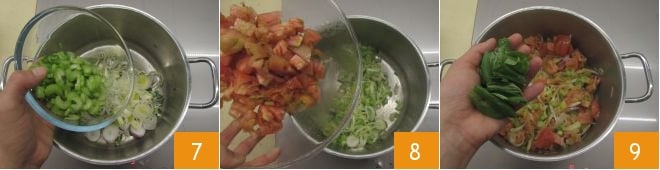 et ajoutez ensuite le céleri, l'oignon vert et le poireau 7. Faites revenir pendant quelques minutes, puis ajoutez les tomates en morceaux 8, les feuilles de basilic 9.