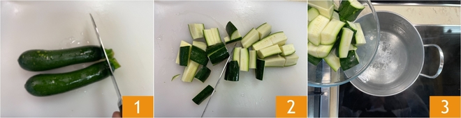 Pour préparer les pâtes froides avec crème de courgettes, pêches et stracciatella, commencez par couper les extrémités des courgettes 1 et coupez-les grossièrement 2. Plongez les courgettes dans de l'eau bouillante salée 3 et faites cuire environ 5 minutes.