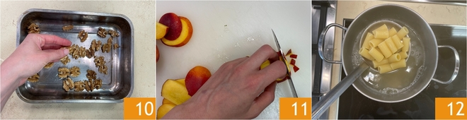 Faites griller les noix dans un four statique à 140°C pendant environ 10 minutes 10, puis laissez refroidir. Pendant ce temps, coupez les pêches en dés d'un demi-centimètre 11. Égouttez les pâtes al dente 12 dans un saladier, assaisonnez avec un filet d'huile et laissez refroidir.