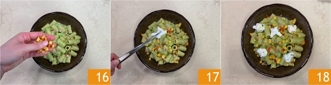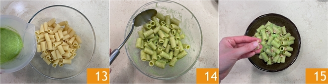 Lorsque les pâtes sont froides, ajoutez la crème de courgettes 13 et mélangez bien 14. Dressez et ajoutez les noix émiettées à la main 15.
