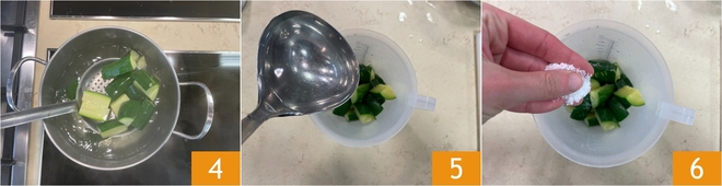 Égouttez les courgettes 4 et transférez-les dans un récipient, puis ajoutez une louche d'eau froide 5 et une pincée de sel 6.