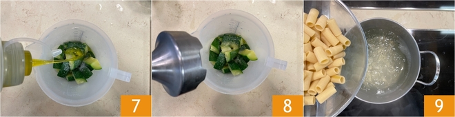Ajoutez également l'huile 7 et mixez avec un mixeur plongeant 8 jusqu'à obtenir une crème lisse. Faites cuire les pâtes dans la même eau où vous avez fait bouillir les courgettes 9.