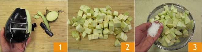 Pour préparer les pâtes froides à la Norma, prenez les aubergines, épluchez-les avec un éplucheur 1 (ne les jetez pas, vous pouvez les couper en julienne et les frire pour décorer le plat si vous le souhaitez), puis coupez-les en dés 2. Salez et laissez-les égoutter dans une passoire pour qu'elles perdent l'eau végétative et l'amertume 3.