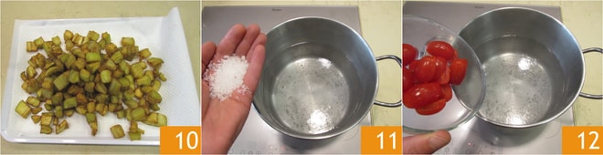 Placez-les sur un plateau recouvert de papier absorbant pour éliminer l'excès d'huile 10. Portez l'eau à ébullition dans une casserole, salez à votre goût 11 et ajoutez 4 tomates cerises 12.