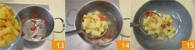 Avec les tomates cerises, faites cuire les pâtes al dente 13, puis égouttez le tout 14 dans le plat de service.
