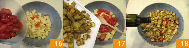 Ajoutez les tomates cerises que vous aviez mises au frigo 16 et les aubergines frites précédemment 17. Mélangez bien et assaisonnez à nouveau avec un filet d'huile d'olive vierge extra 18.