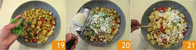Mélangez bien et parfumez avec des feuilles de basilic 19. Assaisonnez avec la ricotta salée râpée en petites copeaux 20 et encore un filet d'huile. Mélangez bien le tout et laissez reposer 5 minutes avant de servir. Vos pâtes froides à la Norma sont prêtes à être dégustées 21 !