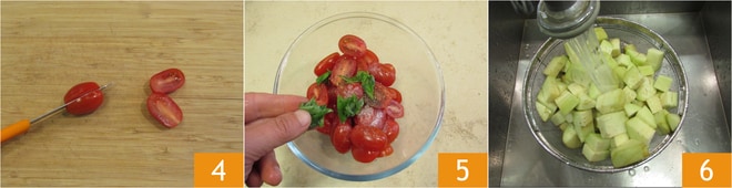 En attendant, lavez les tomates cerises et coupez-les en deux 4. Mettez-en 4 ou 5 de côté tandis que vous pouvez verser les autres dans un bol et assaisonner avec de l'huile, une pincée de sel, du poivre et beaucoup de basilic frais 5. Mélangez le tout et gardez au réfrigérateur, ainsi les saveurs se mélangeront. Rincez les aubergines sous l'eau courante 6.