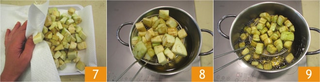 Séchez bien sur un papier absorbant 7. Dans de l'huile déjà chaude, à environ 170-180°, faites frire les aubergines pendant quelques minutes 8. Lorsqu'elles sont dorées, vous pouvez les égoutter 9.