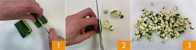 Pour préparer les pâtes froides au thon et courgettes, commencez par équeuter les courgettes et les couper en dés 1 2 3.