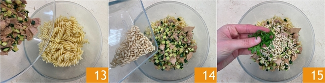 Faites cuire les fusilloni dans la même eau de cuisson que les courgettes 10. Pendant ce temps, ajoutez le thon égoutté aux courgettes 11 et émiettez-le avec la louche, puis versez un peu d'eau de cuisson des pâtes et mélangez pour amalgamer et aromatiser. Éteignez le feu et laissez refroidir la sauce. Égouttez les pâtes dans un bol 12 et laissez-les refroidir également.