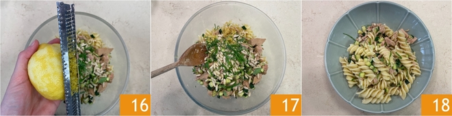 Enfin, arômatiser avec le zeste de citron râpé 16. Mélangez bien le tout 17 et servez vos pâtes froides au thon et courgettes, garnies à votre convenance avec d'autres zestes de citron 18!