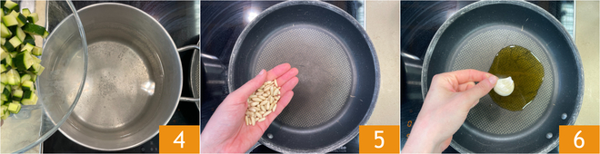 Blanchissez les courgettes dans de l'eau bouillante salée 4 pendant 2 minutes. Pendant ce temps, grillez les pignons de pin dans une poêle antiadhésive 5. Dans une autre poêle, faites revenir l'huile avec la gousse d'ail 6.