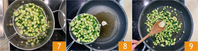 Égouttez les courgettes 7 et transférez-les dans la poêle avec l'huile et l'ail 8, puis sautez-les à feu moyen pendant 15 minutes 9.