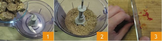 Pour préparer les pâtes froides aux aubergines et feta, commencez par porter à ébullition une casserole d'eau salée qui servira à cuire les pâtes, puis prenez le pain complet rassis coupé en tranches, mettez-le dans un mixeur muni de lames en acier 1 et mixez jusqu'à obtenir des miettes grossières 2. Lavez les piments, retirez-en les graines et hachez-les finement 3.
