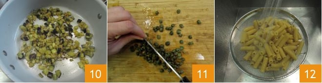 Faites cuire à feu moyen-élevé pendant 4-5 minutes, jusqu'à ce qu'ils soient bien dorés 10, puis retirez l'ail de la poêle, salez et poivrez. Pendant ce temps, rincez les câpres sous l'eau courante pour enlever le sel et hachez-les au couteau 11. Lorsque les pâtes sont al dente, égouttez-les, passez-les rapidement sous un jet d'eau 12