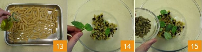 et laissez-les refroidir sur une grande plaque après les avoir assaisonnées avec de l'huile 13. Maintenant, prenez un grand bol et mélangez tous les ingrédients: les cubes d'aubergines dorés, les feuilles de menthe que vous aurez préalablement lavées et séchées 14, les câpres hachées 15,
