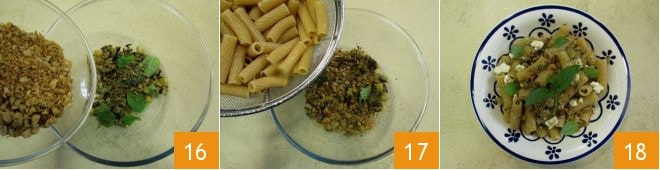 les miettes de pain grillées 16, les tortiglioni complets 17 et enfin la feta émiettée 20. Mélangez bien et répartissez les pâtes ainsi assaisonnées dans les assiettes de service, en garnissant encore avec quelques miettes de feta et de pain 18 : vos pâtes froides aux aubergines et feta sont prêtes à être dégustées!