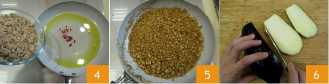 Versez la moitié de l'huile dans une poêle, ajoutez le piment haché et les miettes de pain 4 et laissez-les dorer à feu moyen-élevé pendant quelques minutes, en prenant soin de ne pas les brûler 5. Ensuite, lavez les aubergines et retirez les extrémités; coupez les aubergines d'abord en tranches 6,