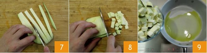 puis en lanières d'environ 1 cm de large 7 et enfin en cubes 8. Faites cuire les pâtes dans une grande quantité d'eau salée à votre convenance. À part, chauffez l'autre moitié de l'huile dans une poêle, ajoutez une gousse d'ail et les cubes d'aubergines 9.