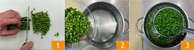 Pour préparer les pâtes froides avec ricotta, avocat et haricots verts, commencez par couper les haricots verts en morceaux 1 et faites-les blanchir dans de l'eau salée 2. Égouttez-les 3 et réservez l'eau de cuisson.