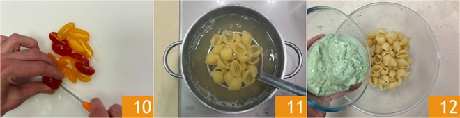 Coupez les tomates cerises 10. Égouttez les pâtes 11 et transférez-les dans un grand bol. Ajoutez la crème de ricotta et avocat 12.