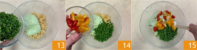 Ajoutez ensuite les haricots verts 13 et les tomates cerises 14. Mélangez bien pour amalgamer les pâtes avec la sauce 15.
