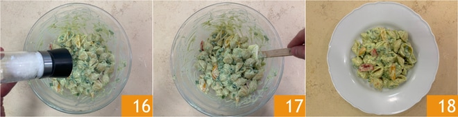 Ajoutez un filet d'huile d'olive, rectifiez le sel et le poivre 16 et donnez un dernier coup de cuillère 17. Vos pâtes froides avec ricotta, avocat et haricots verts sont prêtes à être dégustées 18 !