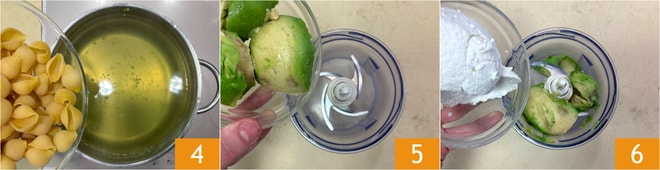 Plongez les pâtes dans l'eau de cuisson des haricots verts et cuisez-les al dente 4. Pendant ce temps, mettez dans un mixeur l'avocat 5 et la ricotta 6.