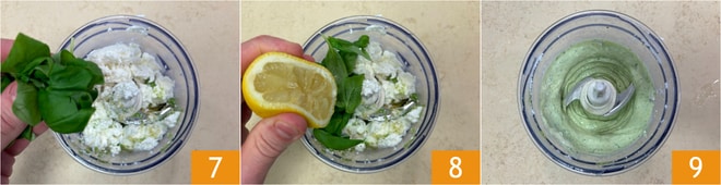 Ajoutez également le basilic 7, le jus de citron 8, une pincée de sel et mixez jusqu'à obtenir une crème lisse et homogène 9.
