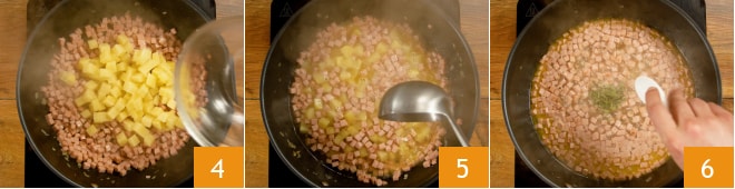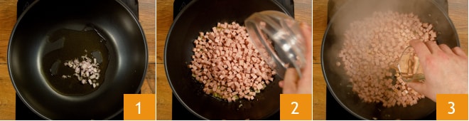 Pour préparer les pâtes pommes de terre et jambon, commencez par préparer le bouillon de viande et gardez-le au chaud. Épluchez l'échalote et hachez-la finement, puis coupez également le jambon cuit en dés et enfin épluchez les pommes de terre et coupez-les en petits cubes. Chauffez une grande poêle sur le feu, versez 5 cuillères à soupe d'huile et ajoutez l'échalote ; laissez-la fondre quelques minutes 1. Ajoutez le jambon 2 et faites-le sauter quelques instants avant de déglacer avec le vin blanc 3.