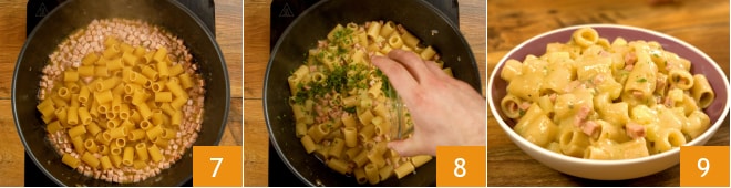 Parfumez avec la sauge hachée 7 et plongez les pâtes : cuisez-les comme un risotto en versant le bouillon chaud petit à petit, de cette façon vous pourrez les cuisiner à la risotto 8. Une fois que les pâtes pommes de terre et jambon sont prêtes, assurez-vous qu'elles sont bien salées, et enfin parfumez avec un brin de persil haché avant de servir 9.