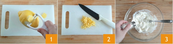 Pour préparer les pâtes rapides avec robiola et bresaola, faites bouillir l'eau pour cuire les pâtes. Pendant ce temps, préparez la sauce en prélevant le zeste du citron avec un éplucheur, en veillant à ne prendre que la partie jaune 1. Hachez finement le zeste avec un couteau 2. Dans un bol, mélangez la robiola pour l'assouplir, puis assaisonnez avec du sel 3, du poivre