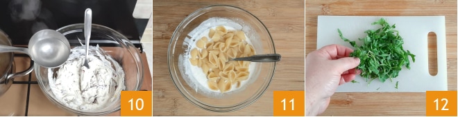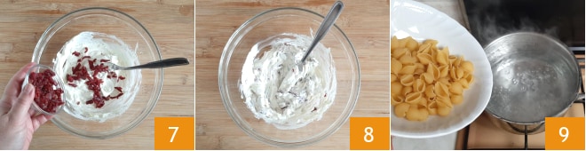 ajoutez les autres à la crème de robiola 7, puis mélangez pour homogénéiser 8. Cuisez les pâtes selon le temps de cuisson indiqué sur l'emballage 9.