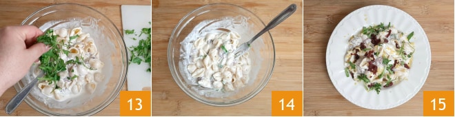 et ajoutez-la également aux pâtes 13. Mélangez pour assaisonner 14 et servez immédiatement les pâtes rapides avec robiola et bresaola, en garnissant les plats avec des zestes de citron et des lanières de bresaola réservées 15.